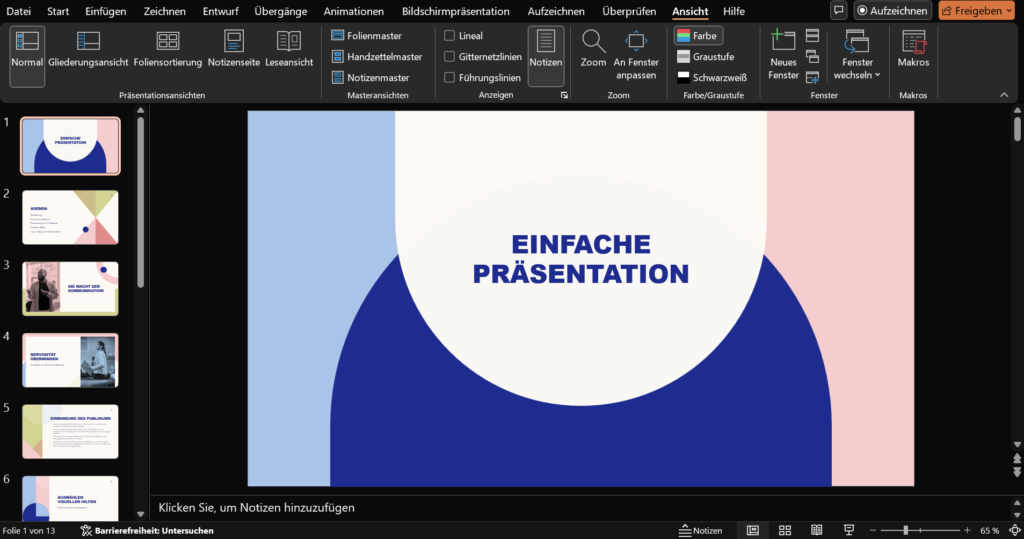 PowerPoint ist dafür ausgelegt, dass sowohl einfache als auch aufwendige Präsentationen gestaltet werden können. Es existieren entsprechende Vorlagen und Werkzeuge, die genutzt werden können.