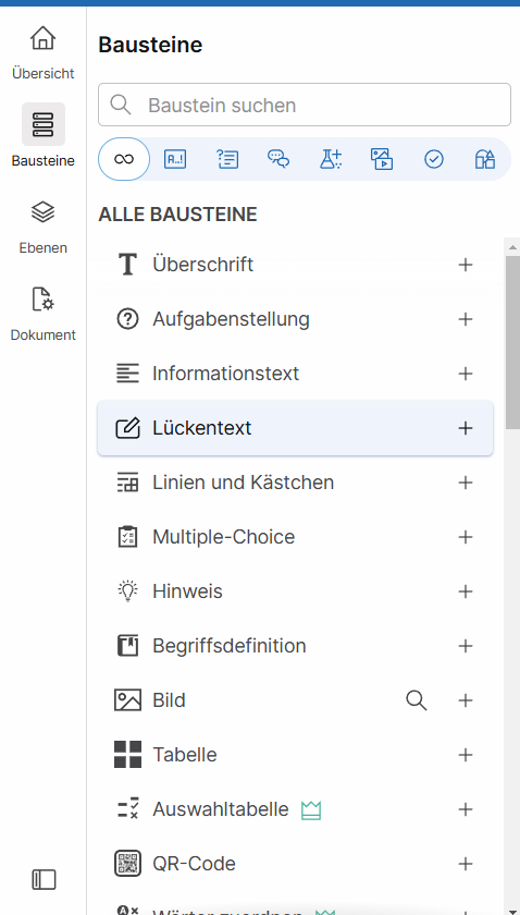 Tutory bietet eine Vielzahl von vorgefertigten Elementen, welche die Erstellung von Arbeitsblättern deutlich erleichtern, wodurch Zeit gespart werden kann. Dazu gehören unter anderem Multiple-Choice-Fragen, Lückentexte, Zuordnungsaufgaben und Textfelder für offene Fragen und etliche weitere.