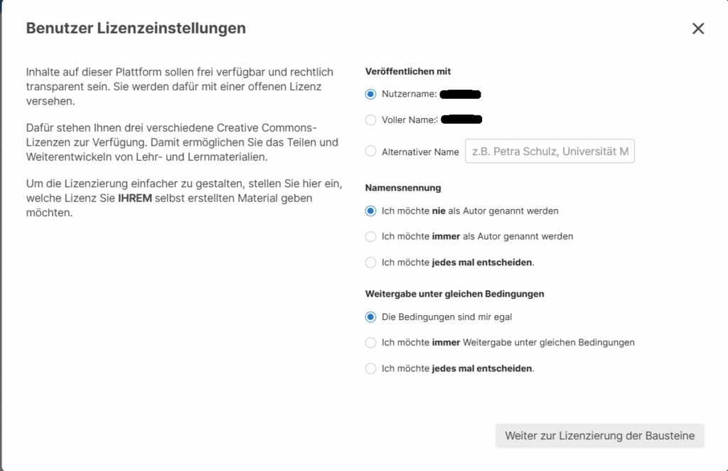 Tutory ermöglicht eine einfache Lizenzierung von Arbeitsblättern und Materialien mit Creative Commons. Bereits während des Erstellens können Nutzende angeben, wie ihre Inhalte geteilt und weiterverwendet werden dürfen. Die Lizenzinformationen werden dann durch die Software automatisch auf den Materialien eingefügt.