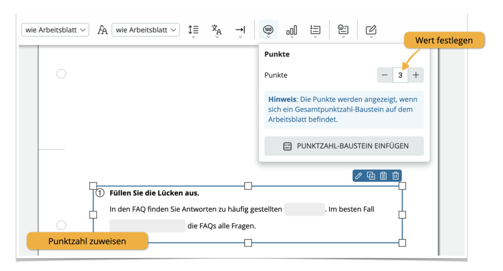 Tutory bietet eine Funktion zur automatischen Punkteberechnung, die von Lehrenden insofern genutzt werden kann, dass Lernkontrollen schneller bewertet werden können und entsprechendes Feedback gegeben werden kann. Die Punktwerte für einzelne Aufgaben können direkt in das Arbeitsblatt integriert werden, und die Berechnungen erfolgen automatisch, sobald die Antworten eingegeben oder markiert werden.