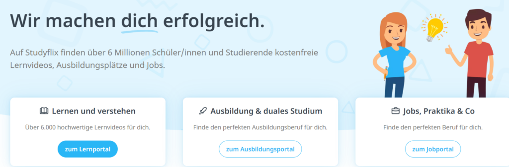 Studyflix ist eine E-Learning-Plattform, welche den Nutzern kostenlos mit hochwertigen Lernvideos und interaktiven Inhalten unterstützt. Auf Studyflix ist ebenfalls eine Ausbildungs- und Jobbörse integriert.