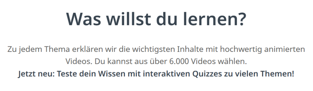 Studyflix bietet eine Sammlung von über 6.000 animierten Lernvideos zu verschiedenen Fächern und Themen, die Informationen kompakt und effizient vermitteln. Zusätzlich stellt die Plattform interaktive Quizzes zu vielen Themengebieten bereit, um den Lernprozess aktiv zu unterstützen und das Verständnis zu vertiefen. Bevor die Videos veröffentlicht werden, durchlaufen sie einen Qualitätssicherungsprozess, bei dem Experten die Inhalte auf Richtigkeit und Relevanz prüfen.