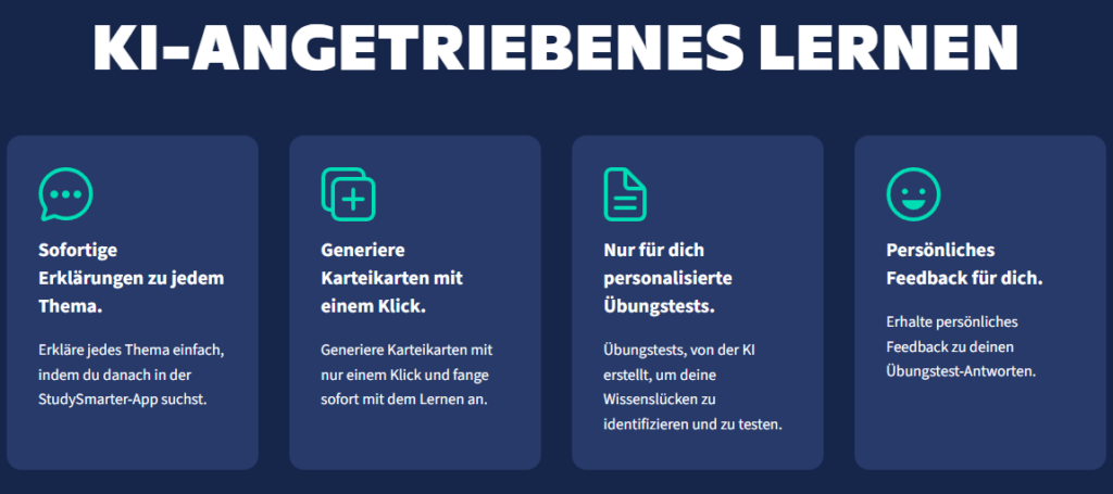 StudySmarter hat eine eingebaute KI namens „Explain AI“. Nutzer können gezielt Fragen zu spezifischen Themen stellen oder Erklärungen anfordern, die ihrem aktuellen Verständnisstand entsprechen. Durch die Erstellung personalisierter Karteikarten und Übungstests passt sich die KI dem individuellen Lernfortschritt an. Dies fördert ein effizientes und zielgerichtetes Lernen, da die Nutzer sich auf die Bereiche konzentrieren können, in denen sie am meisten Unterstützung benötigen.