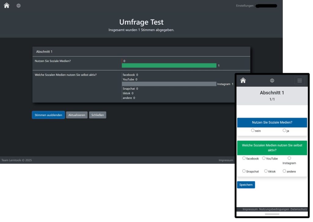Das Umfragetool auf Lerntools ermöglicht es Lehrenden, einfache Umfragen und Fragebögen zu erstellen, um Feedback von Lernenden zu sammeln oder Wissen abzufragen. Die Vorlagen erleichtern die Erstellung, und die gesammelten Daten können anonym ausgewertet werden.