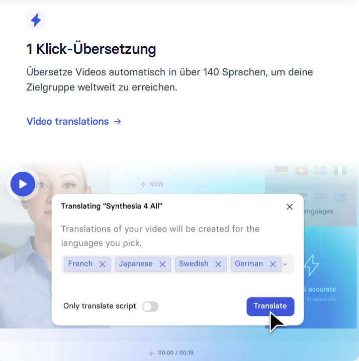 Der mehrsprachige Player passt sich automatisch der Sprache des Publikums an, sodass Videos einfach mit unterschiedlichen Personen weltweit geteilt werden können. Mit der 1-Klick-Übersetzung können Videos in über 140 Sprachen übersetzt werden, während die Originalstimme der sprechenden Person beibehalten wird.