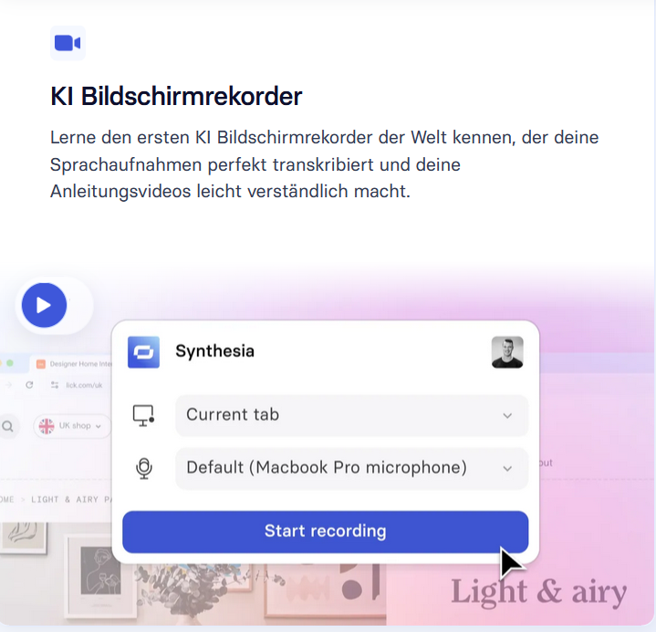 Der integrierte KI-Bildschirmrekorder von Synthesia ermöglicht die einfache Erstellung von Bildschirmaufzeichnungen ohne zusätzliche Tools. Der Rekorder transkribiert die Sprachaufnahmen und erleichtert somit die Nachbearbeitung. Diese Funktion kann vor allem zur Erstellung von Anleitungen oder kurzen Erklärvideos genutzt werden.