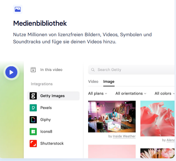 Synthesia.io stellt eine Vielzahl an Vorlagen für verschiedene Anwendungsfälle bereit. So können Videos schnell und ohne Vorkenntnisse erstellt werden. Die umfassende Mediendatenbank stellt lizenzfreie Bilder, Videos, Symbole und Soundtracks zur Verfügung.