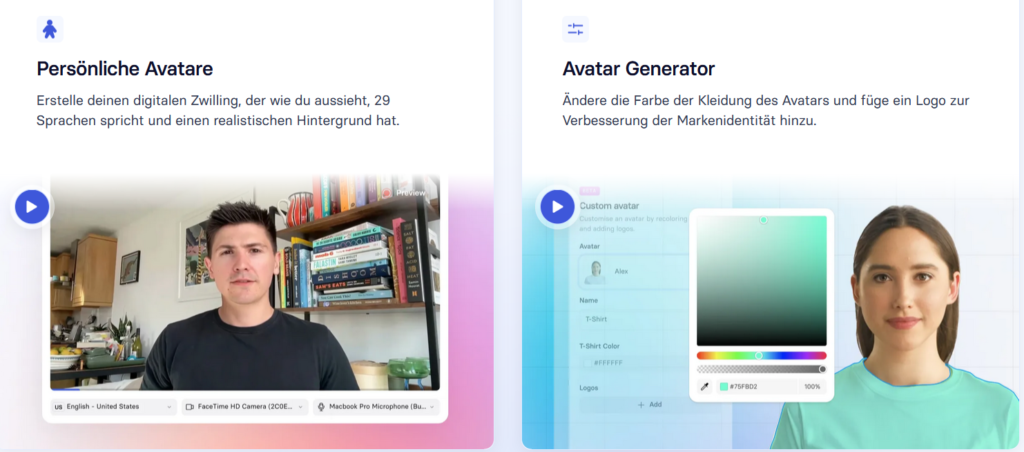 Synthesia.io ist eine KI-gestützte Webanwendung, die eine Erstellung professioneller Videos ermöglicht, ohne die Notwendigkeit von klassischen Aufnahmegeräten. Die Plattform bietet eine große Auswahl von Avataren, die individuell angepasst werden können, um dem jeweiligen Präsentationszweck angepasst zu werden. Mit Funktionen wie dem mehrsprachigen Player oder der 1-Klick-Übersetzung können die Videos auch global geteilt und genutzt werden. Mithilfe eines KI-Stimmengenerators können schnell und einfach qualitativ hochwertige Voiceover durch Texteingaben erstellt werden.