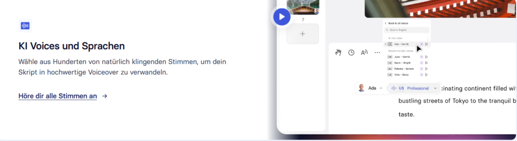 Durch den KI-Stimmengenerator können Texteingaben automatisch in professionelle Voiceovers umgewandelt werden. Aus einer Vielzahl von Stimmen kann ausgewählt werden, um die gewünschte Stimmung bzw. den gewünschten Charakter auszuwählen. So können Inhalte mit sprachlicher und stimmlicher Varianz in hoher Qualität erzeugt werden.